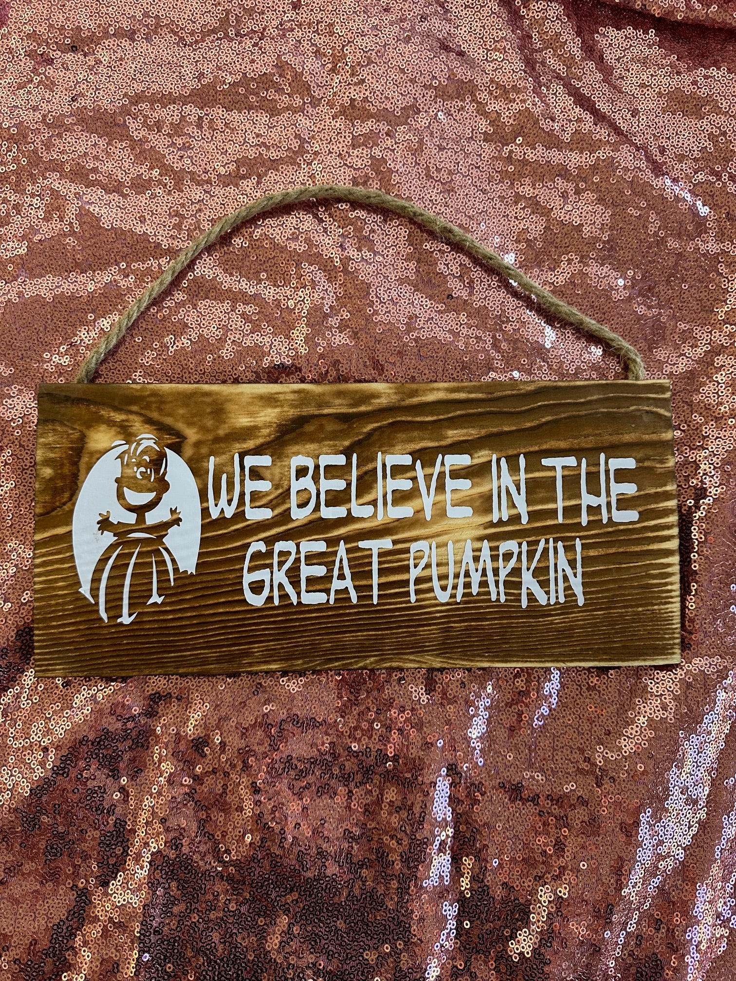 “We believe in the Great Pumpkin!” — a charming wooden sign for your Halloween or fall décor.