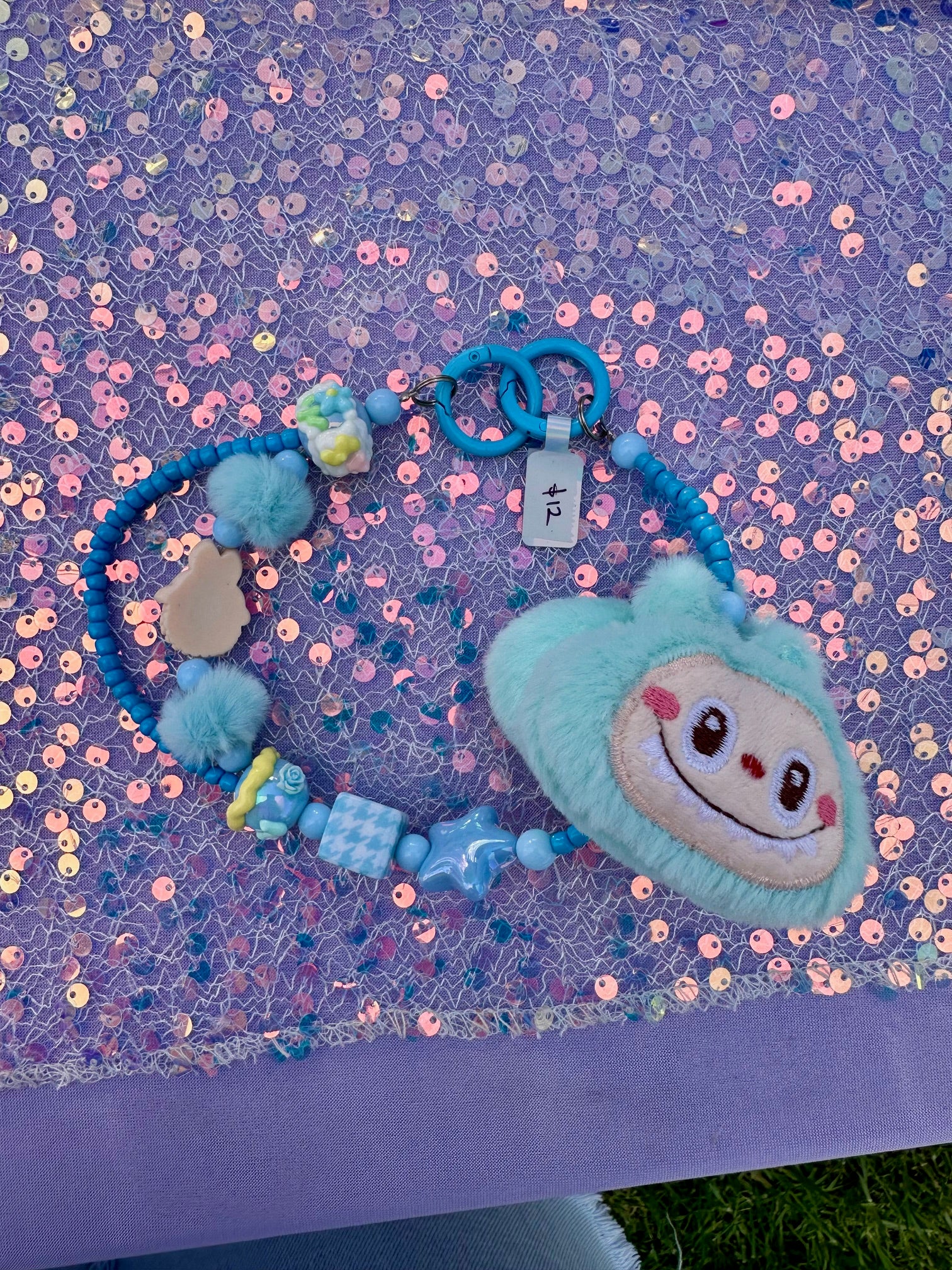 Pastel charm bracelet featuring chunky beads, a fluffy pom-pom, and a cheeky little Labubu (not official merchandise, just cute). Perfect for anyone who loves playful, weird-cute accessories