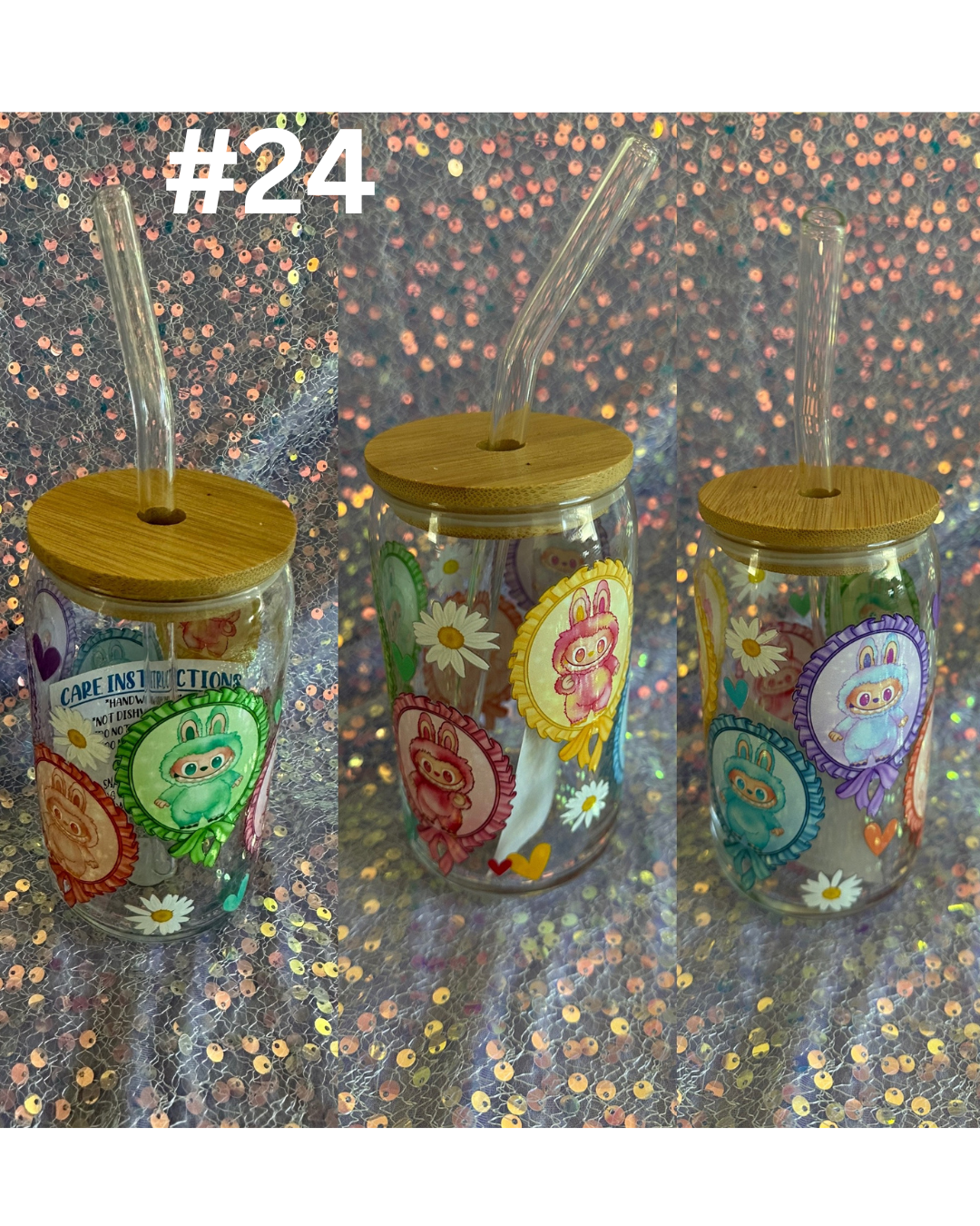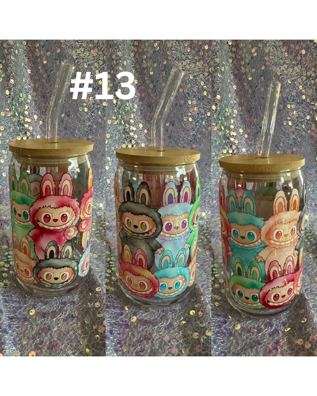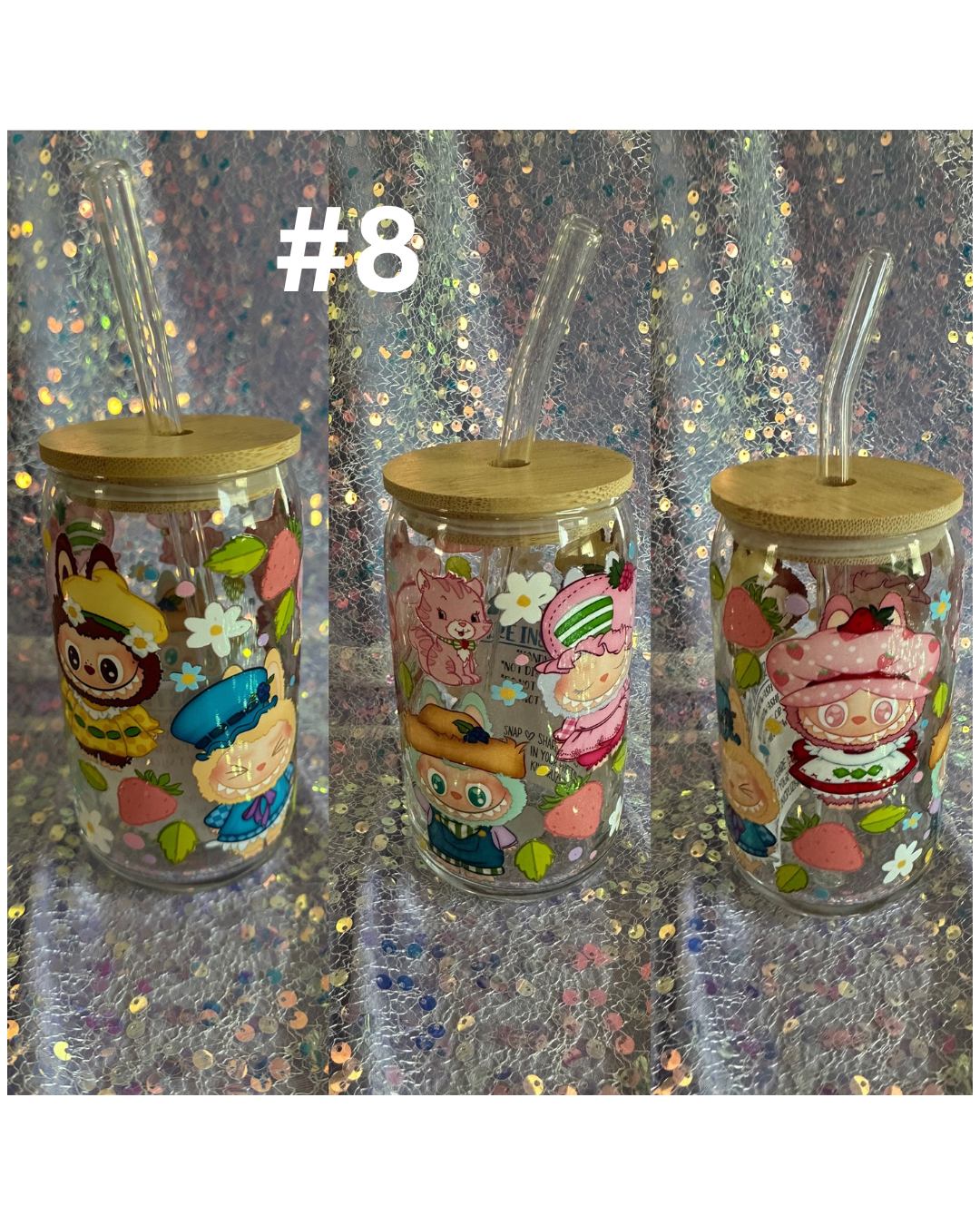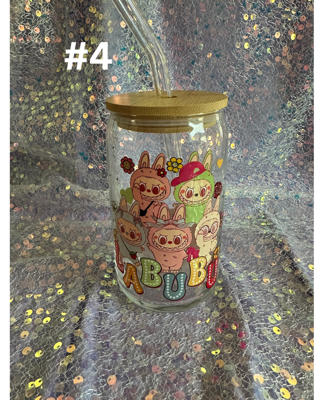 Adorable Labubu/Sonny Angel-inspired glass cup with bamboo lid and straw (not official merchandise). Perfect for iced coffee, tea, or boba!